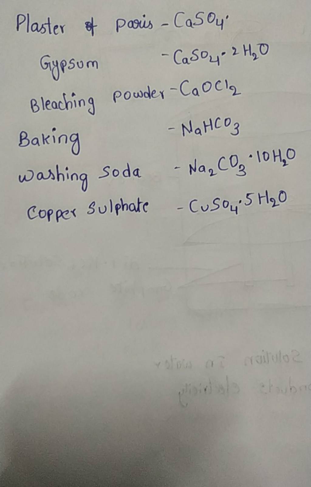 Plaster of paris CaSO4 Gypsum CaSO4 −2H2 O Bleaching powder −CaOCl2