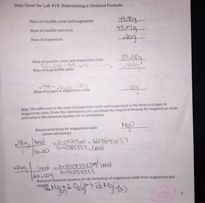 Solved Data Sheet for Lab 10 Determining a Chemical Sources Of Error In Magnesium Oxide Lab Since we are using air as our source of oxygen, we may form some magnesium nitride during the experiment. (remember that air is over 70%. In each case below, decide whether the. When magnesium and oxygen are heated together, they readily undergo a chemical change (reaction): A combustion reaction carried out in a heated crucible using a bunsen burner can. Sources Of Error In Magnesium Oxide Lab.