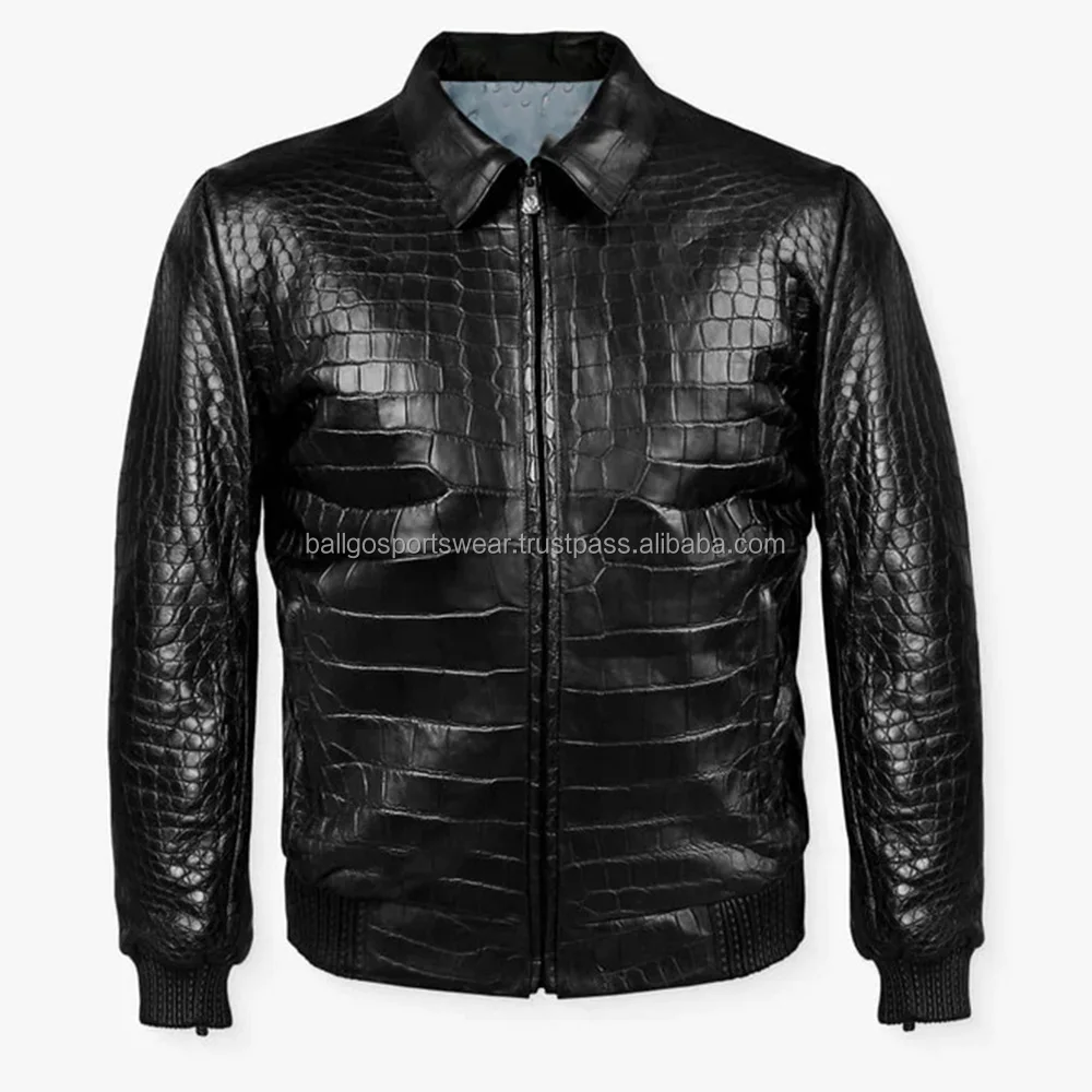 Men's Croc Leather Jacket New Crocodile Embossed Black Genuine Cowskin