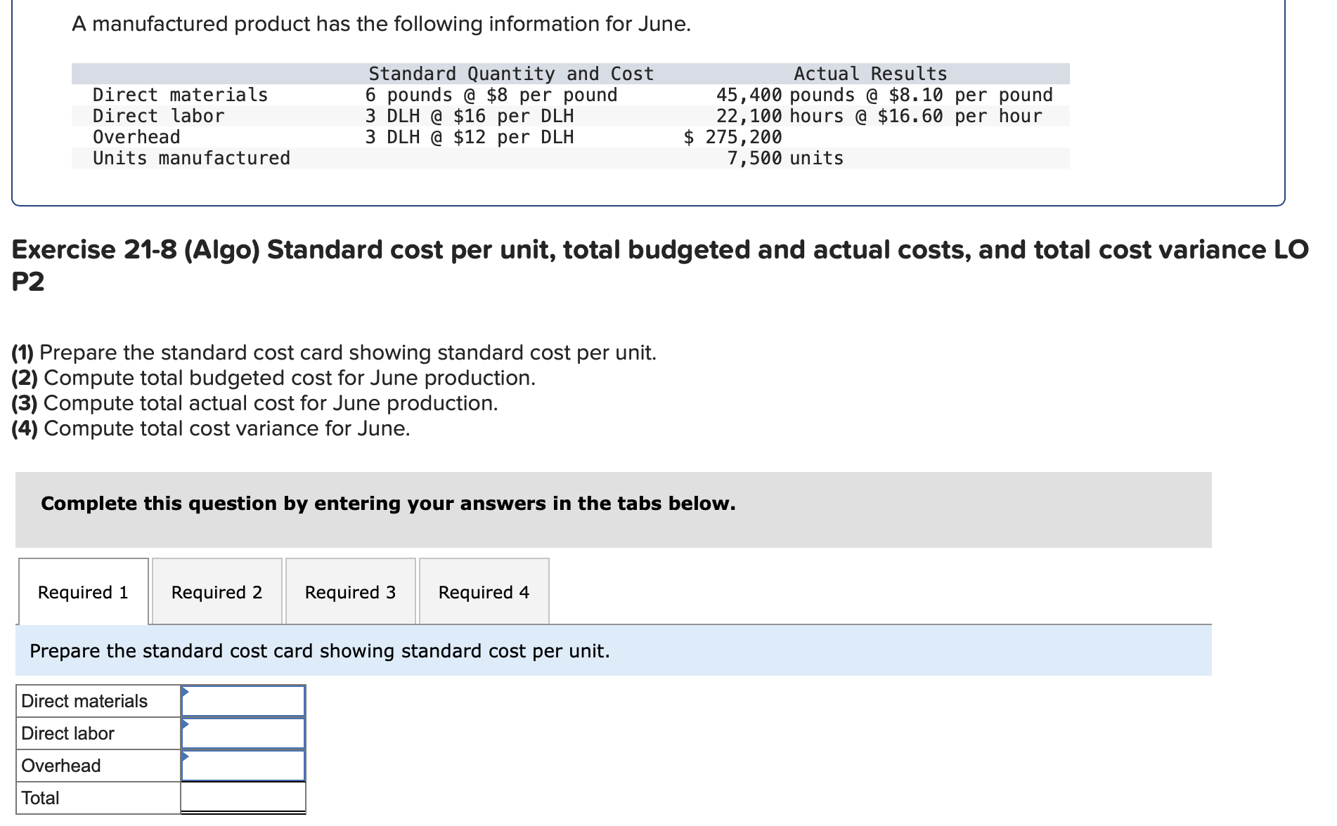 Solved The standard cost card for the single product What Is A Standard Cost Quizlet To provide a distinct measure of cost control. Any amount that appears on a. The standard cost of the material was $2 per kilogram and there was an unfavorable materials price variance of $3,250. A standard cost is 1)a cost which is paid for a group of similar products. The total number of units times the budgeted amount expected. The. What Is A Standard Cost Quizlet.