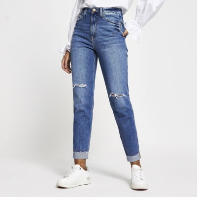 Blue ripped high waisted mom stretch jean River Island