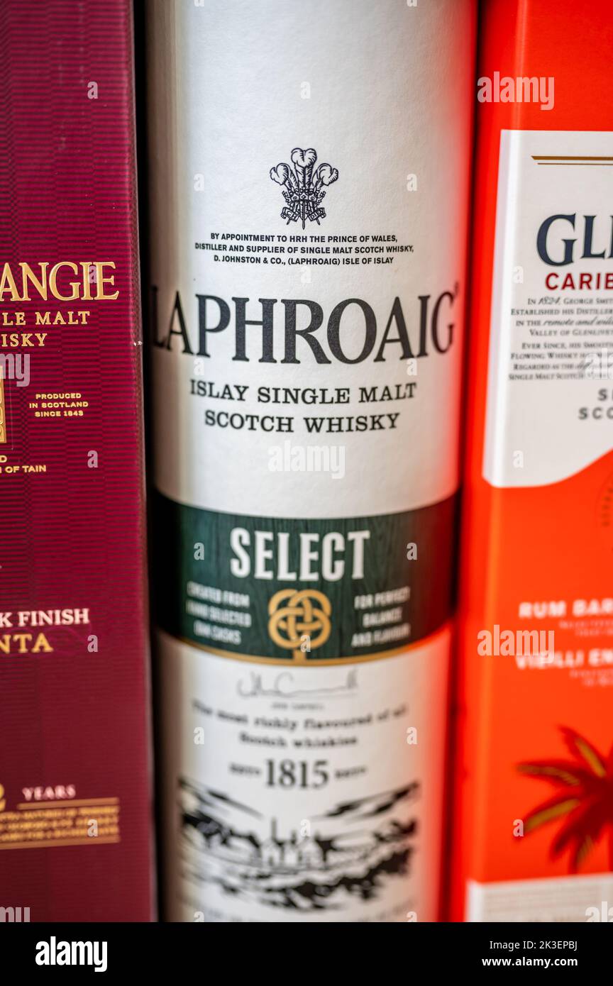 Calgary, Alberta September 10, 2022 Multiple Single Malt Scotch Whisky containers staked