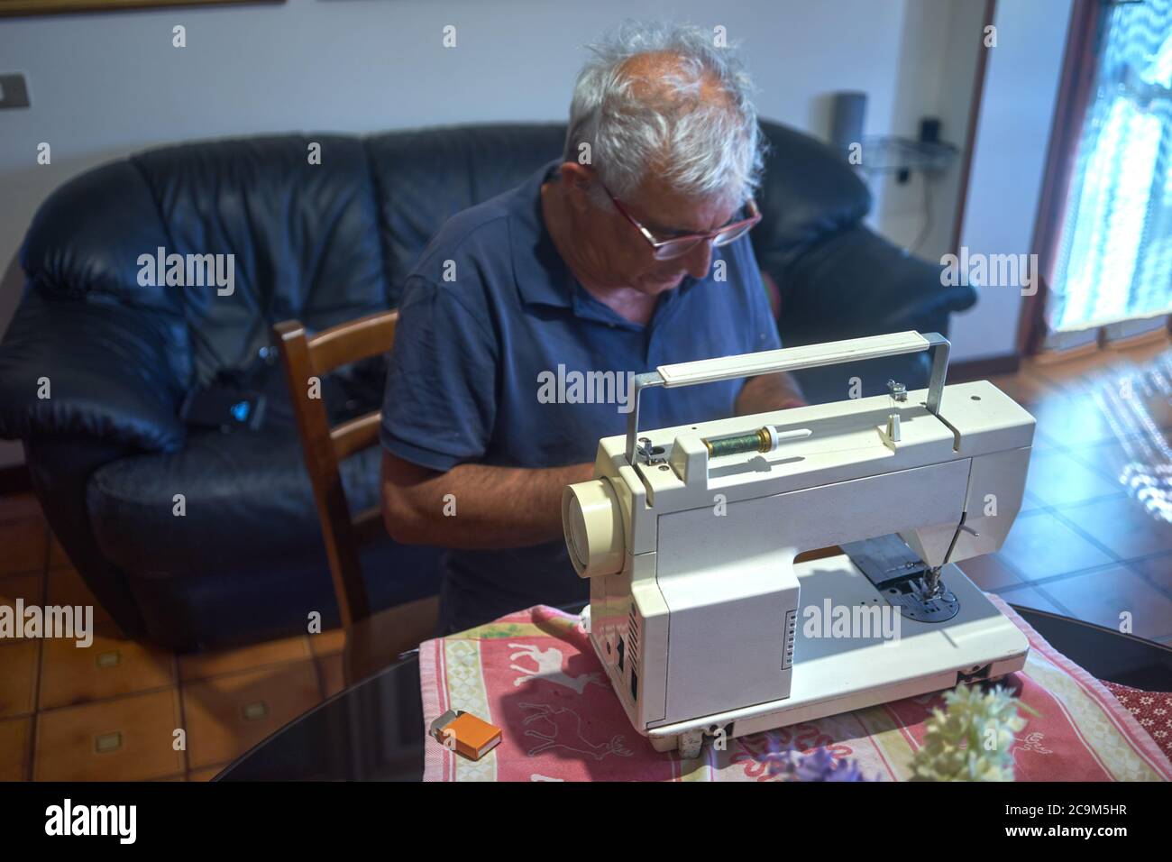 elderly man using a sewing machine Stock Photo Alamy