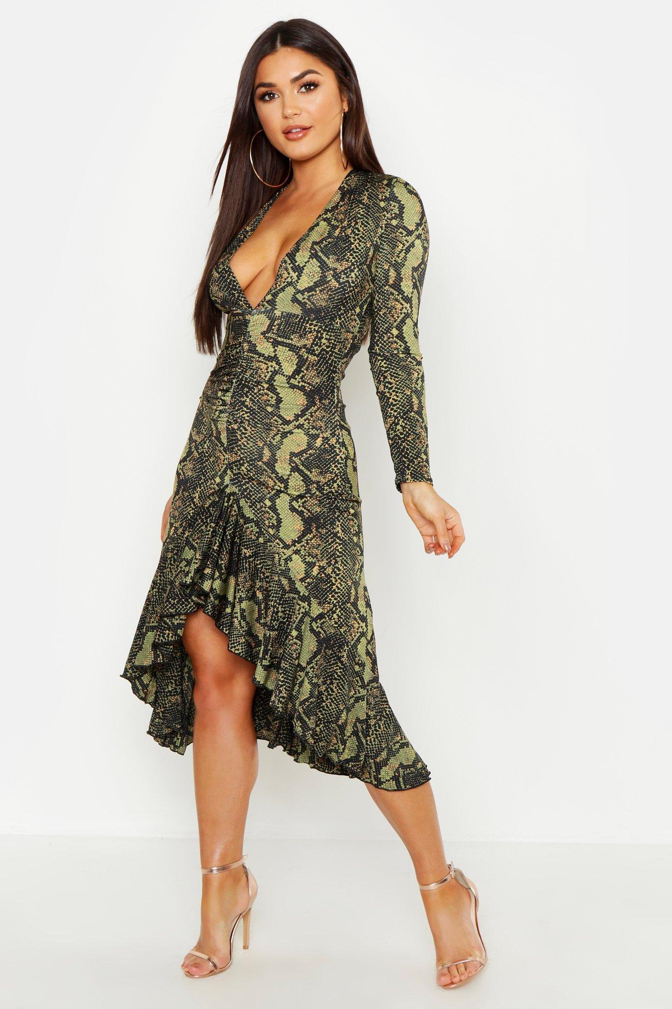 Boohoo Snake Print V Plunge Front Midaxi Dress in Green Lyst