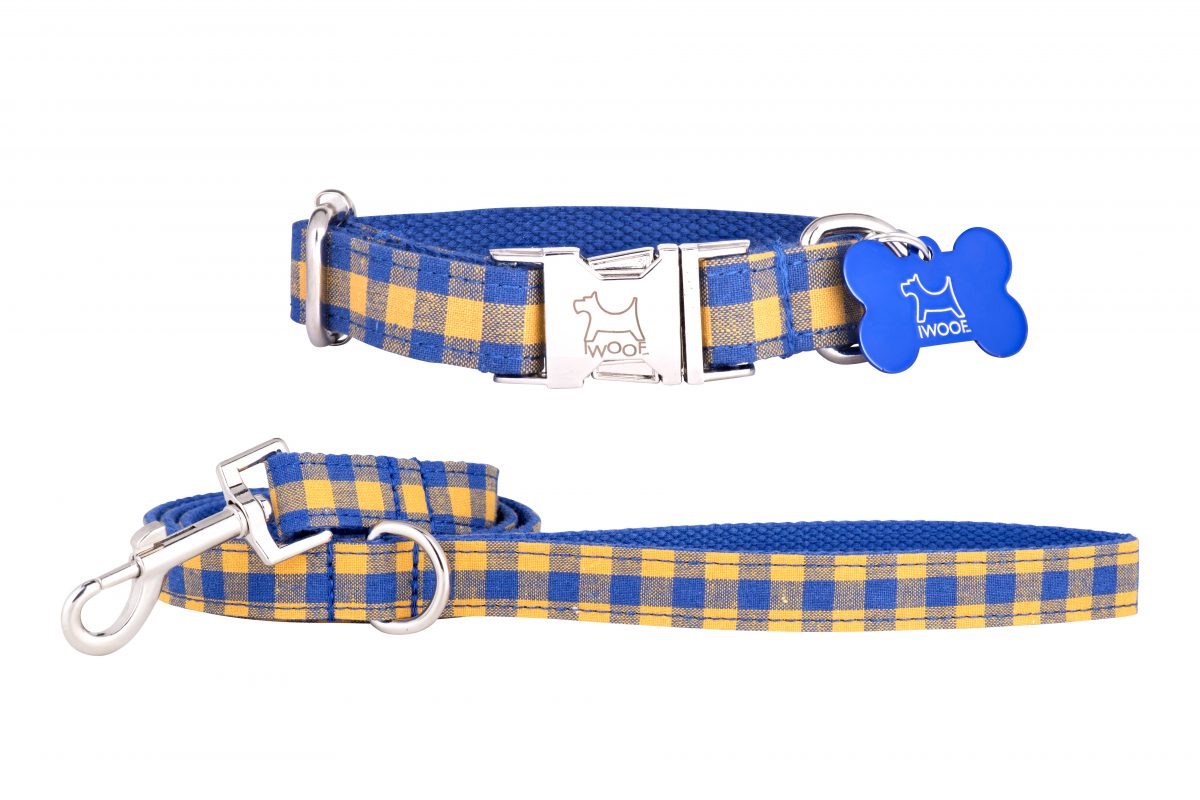 Designer Dog Collar and Lead set in Blue and yellow Check by in Designer Dog Collars
