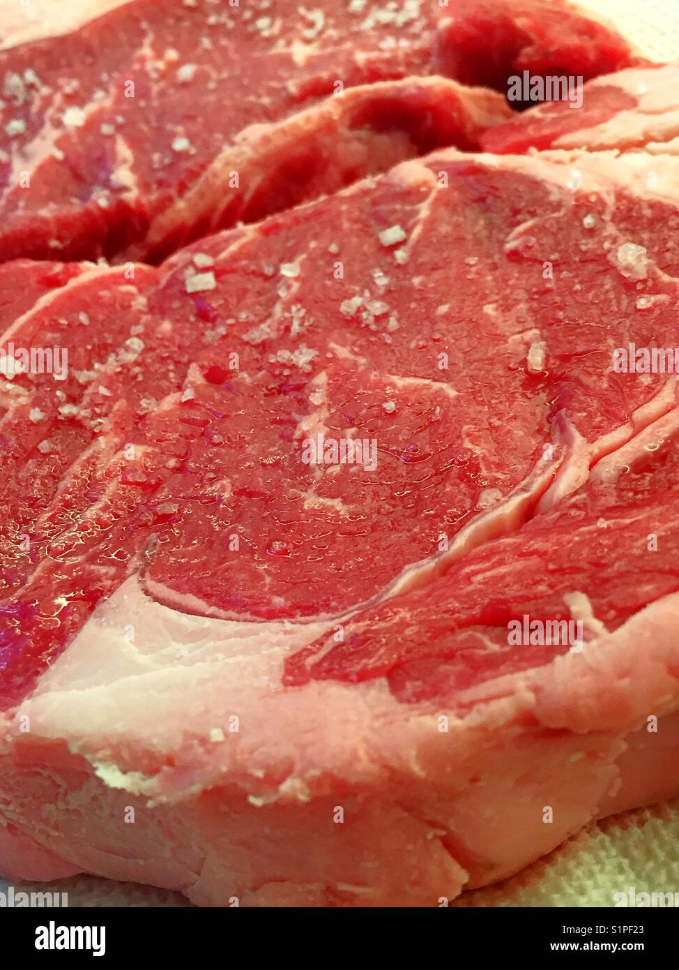 Raw ribeye steaks prepped with kosher salt, USA Stock Photo Alamy
