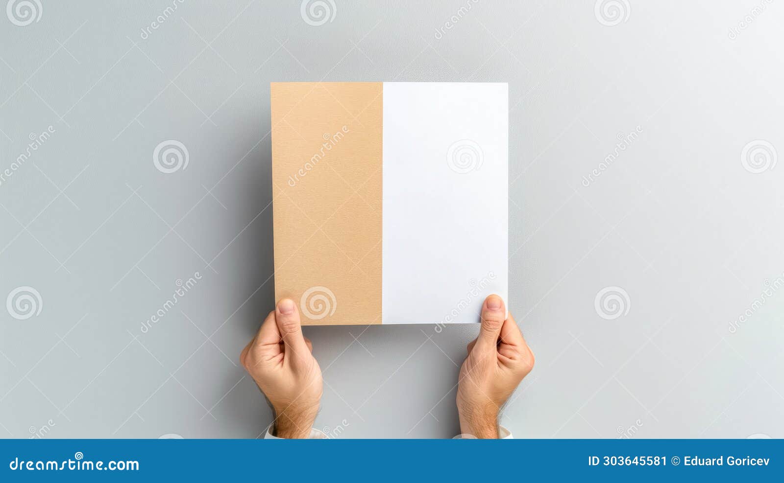 Hands Holding a Halfbrown, Halfwhite Cardboard on a Gray Background