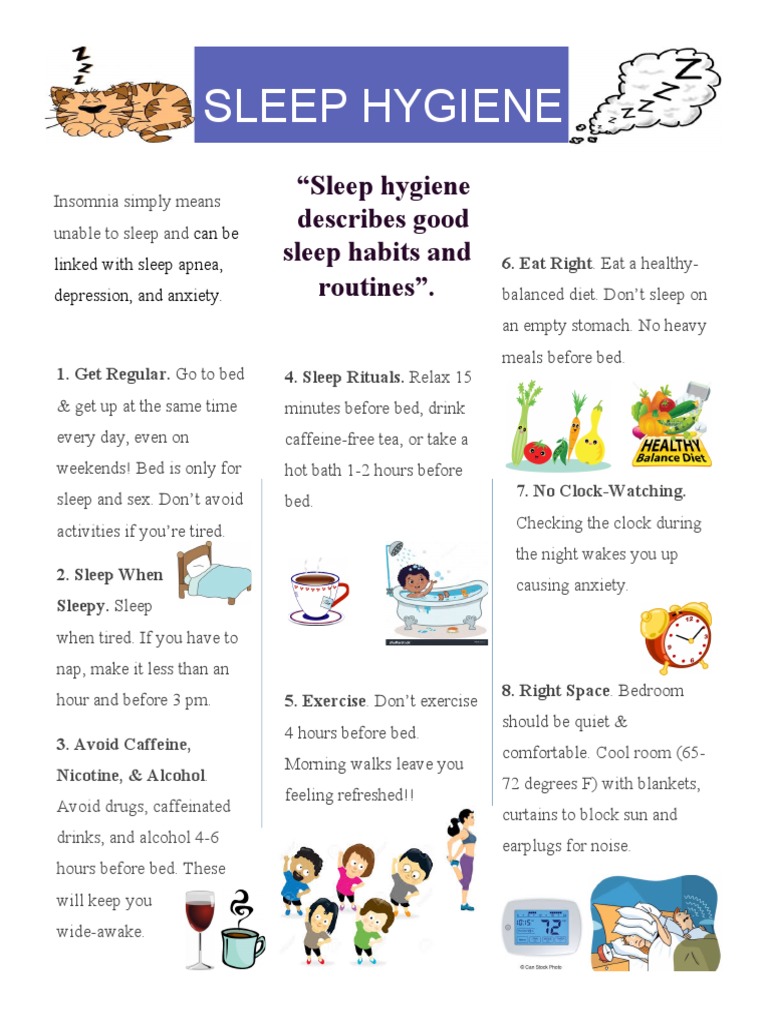 Maintaining Sleep Hygiene in order to get Better Sleep at NightBy Dr Sleep Hygiene Advice Leaflet Do not watch the clock to prevent anxiety or pressure to fall. Waking, sleeping too much, or restless or unsatisfying sleep. Keep your bedroom for sleeping and intimacy, do not work, watch tv, or eat in bed. This leaflet has been written by dr eriksson and prof walker to provide patients, their family or carers with information about sleep hygiene.. Sleep Hygiene Advice Leaflet.