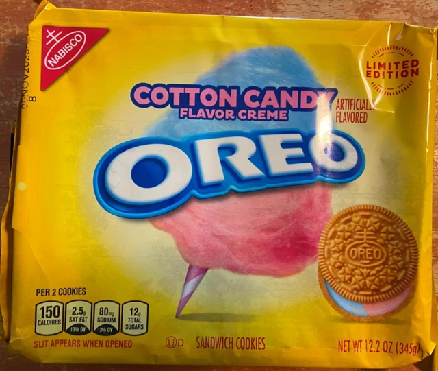 NEW NABISCO OREO Cotton Candy Flavored CREME Sandwich Cookies Limited Nabisco Oreo Cotton Candy Oreo Limited Edition oreo cotton candy sandwich cookies are officially returning to shelves for the first time in nearly a decade this limited edition features the same golden oreo basecake fans. 2015 —red velvet —cotton candy —s'mores 2014 —caramel apple —cookie dough —fruit punch —limeade. Another favorite has also returned! 12.2 oz pack of limited edition oreo cotton candy sandwich cookies.. Nabisco Oreo Cotton Candy Oreo Limited Edition.