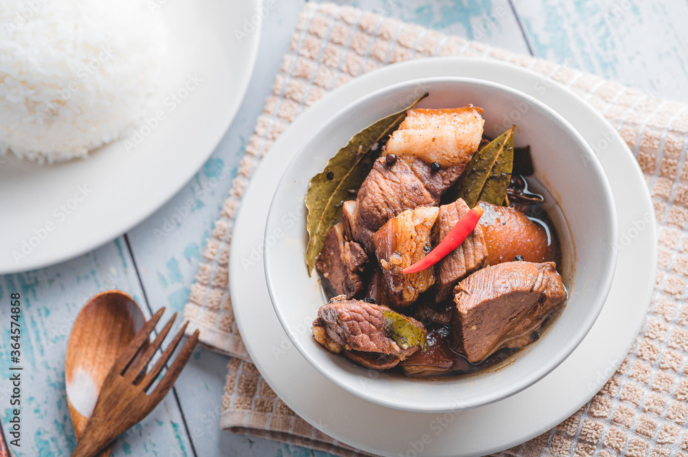 Pork Adobo (Flat lay) is a Filipino dish stewed in vinegar, garlic