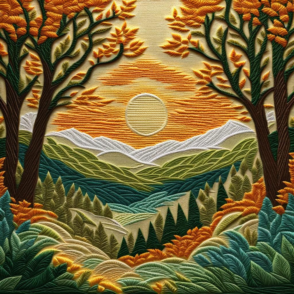 Crewel embroidery, Embroidered sun rising in a forest of embroidered