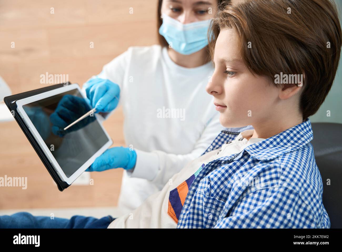 Woman dentist shows dental image on clipboard to young patient Stock