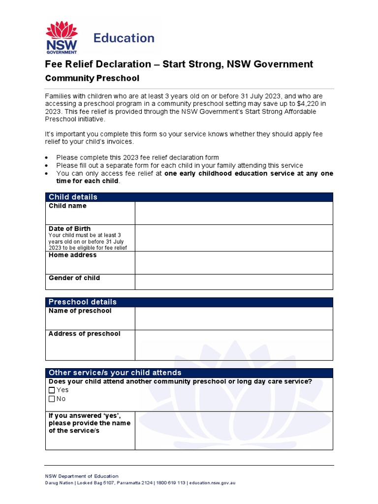 Start Strong NSW Government FORM Fee Relief Declaration CPS PDF