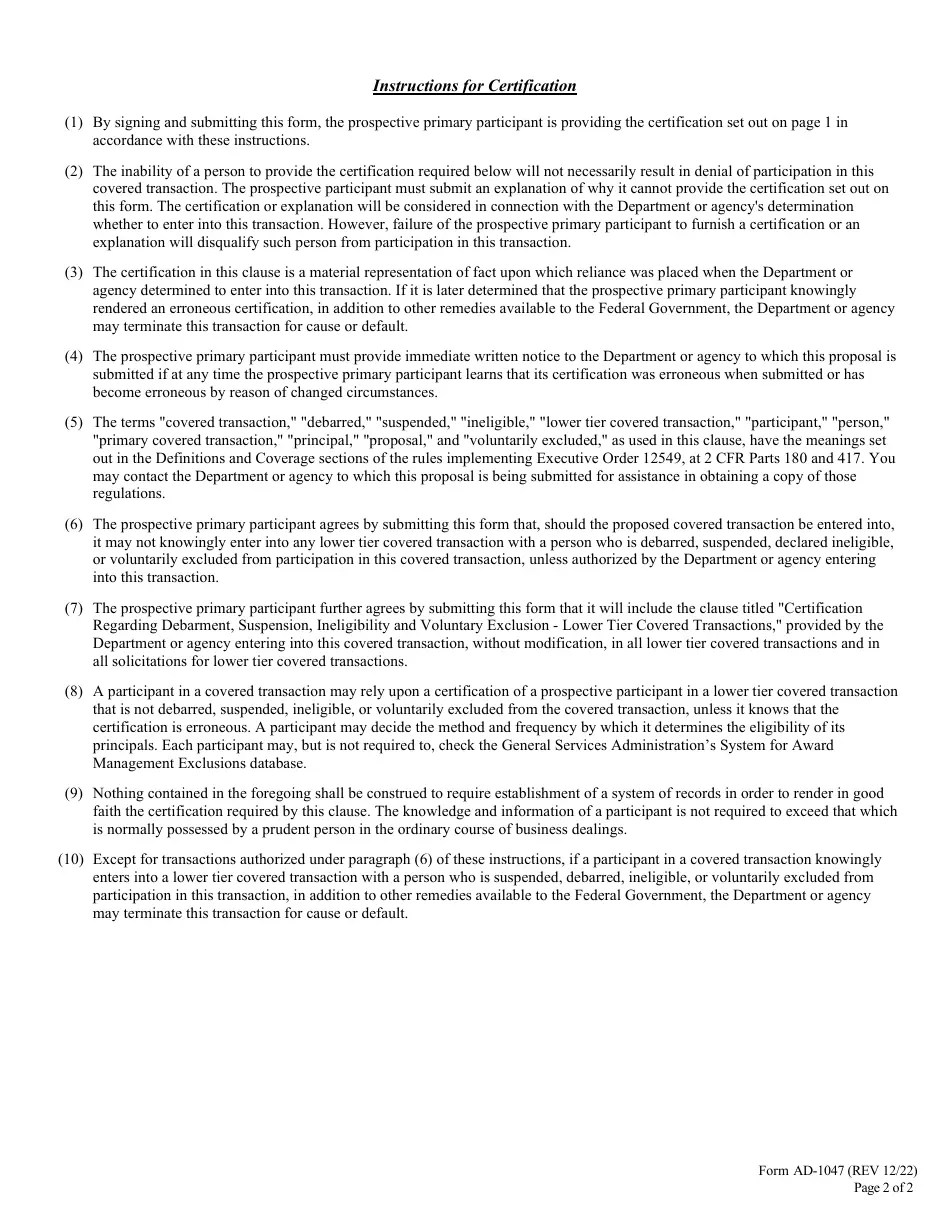 Form AD1047 Download Fillable PDF or Fill Online Certification Suspension And Debarment Form The form requires you to certify that neither your firm nor principals of the firm are debarred or suspended from participating in federal non. (a) are not presently debarred,. What is suspension and debarment? Suspensions and debarments are administrative remedies used to prevent the government from. Suspension and debarment actions prevent companies and individuals from participating in government contracts,. Department. Suspension And Debarment Form.