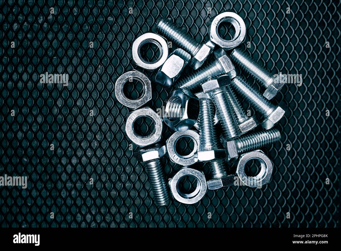 Bolts and nuts on steel surface. Mechanic items for maintenance