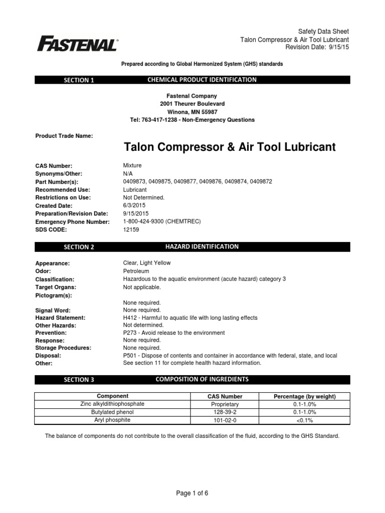 Talon Compressor and Air Tool Lubricant SDS English PDF