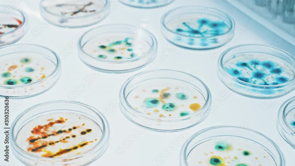 Microbiology Laboratory Petri Dishes with Various Bacteria Samples