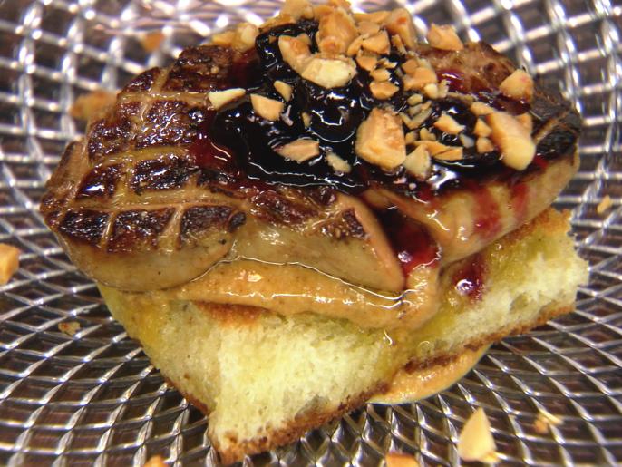 Peanut Butter and Jelly Foie Gras Sandwich Plate Foie Gras Peanut Butter Jelly Sandwich Lay the slices of bread on a bread board. Let it cool for 1 hour. Chuck's eat the street episode: Sprinkle with coarse sea salt. Spread the foie gras mousse on 4 of the slices. Roasted pecans, hazelnuts, macadamia, brazil nuts or peanuts work well, too. Recipe courtesy of cafe vermilionville show: Combining different nuts is also fun to experiment. Foie Gras Peanut Butter Jelly Sandwich.