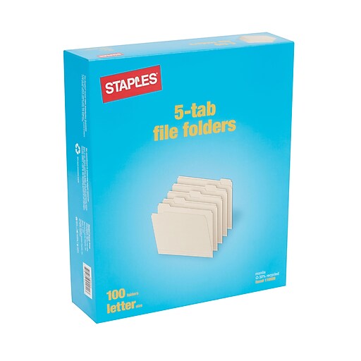 Staples® Manila File Folders, Letter, 5 Tab, Assorted Position, 100/Box