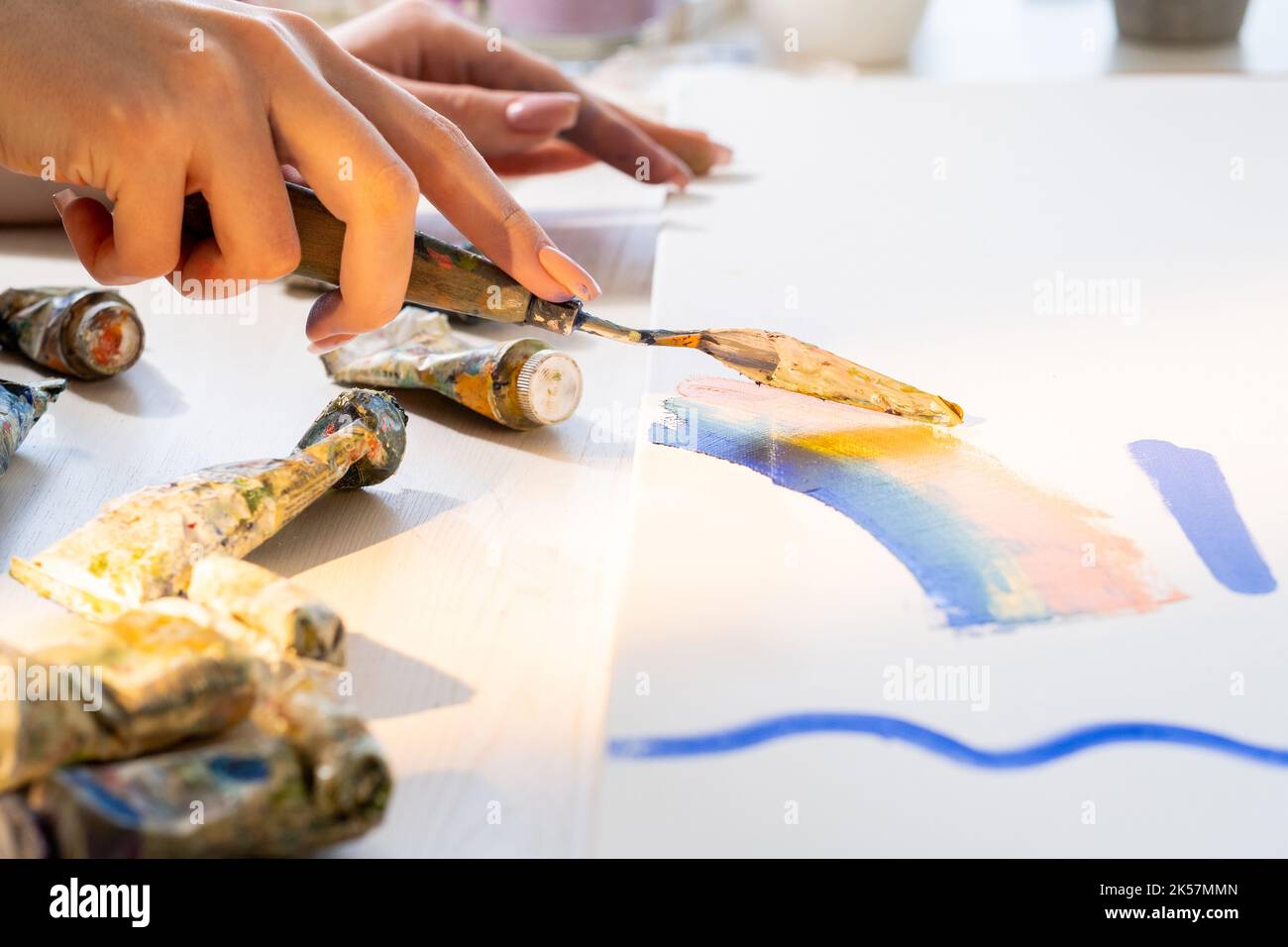 Painting process. Abstract style. Artistic tools. Creative master class. Unrecognizable woman