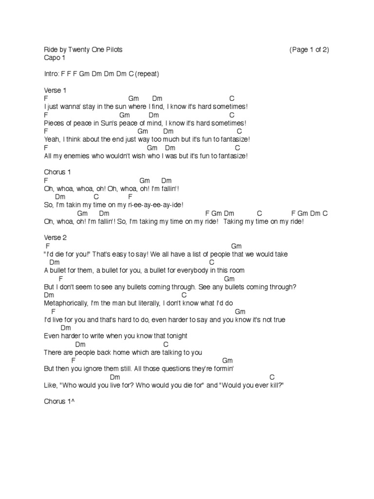 Twenty One Pilots Ride Chord Sheet PDF Songs Musical Compositions Chord Ride Twenty One Pilots Original ride chords by twenty one pilots. 601,369 views, added to favorites 15,337 times. Learn to play guitar by chords / tabs using chord diagrams, watch video lessons and more. See realtime chords on guitar, piano and ukulele as you are listening the song. [intro] | g am | em c | | g am | em d |. Chord Ride Twenty One Pilots Original.