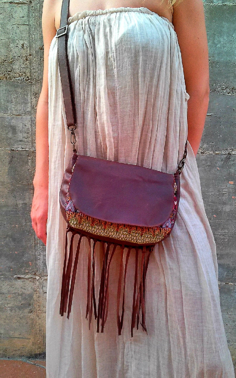 Large dark brown fringes leather boho purse Bohemian messenger and Boho Brown Messenger Bag Small hippie flap style messenger bag with butterfly and flowers in brown and purple cotton and burlap. Introducing the stylish messenger bag made from soft vegan leather with handcrafted details, a perfect blend of bohemian style and modern. Check out our boho messenger bag selection for the very best in unique or custom, handmade pieces from our bags & purses. Boho Brown Messenger Bag.