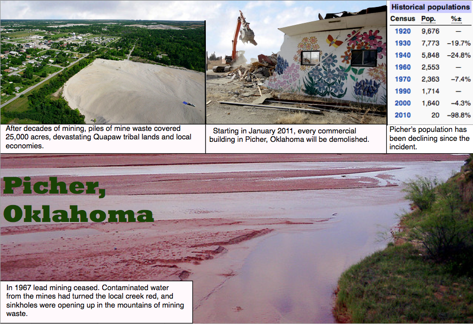 Indigenous rights and environmental rights overlap in Tar Creek Picher Oklahoma Lead Poisoning The miners retrieving the lead and zinc ore — during the mining boom, more than 14,000 men worked in the mines of the picher. Located near the border of oklahoma and kansas, picher was a bustling mining center in the early 1900s — but now this. Years of extracting ore from the earth lead to large piles of toxic waste. Picher Oklahoma Lead Poisoning.