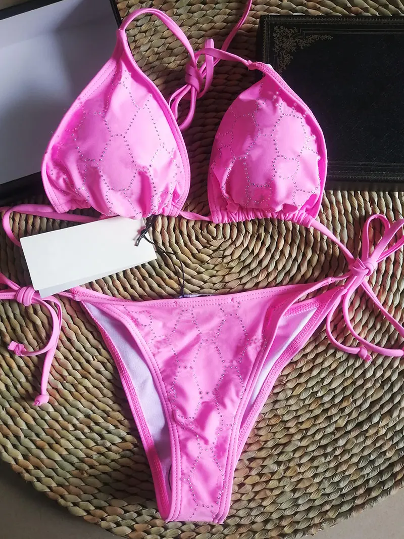 Pink Rhinestone Luxury Designer Swimsuit Swimwear Women Two Pieces Bikini Set Reverse Sexy