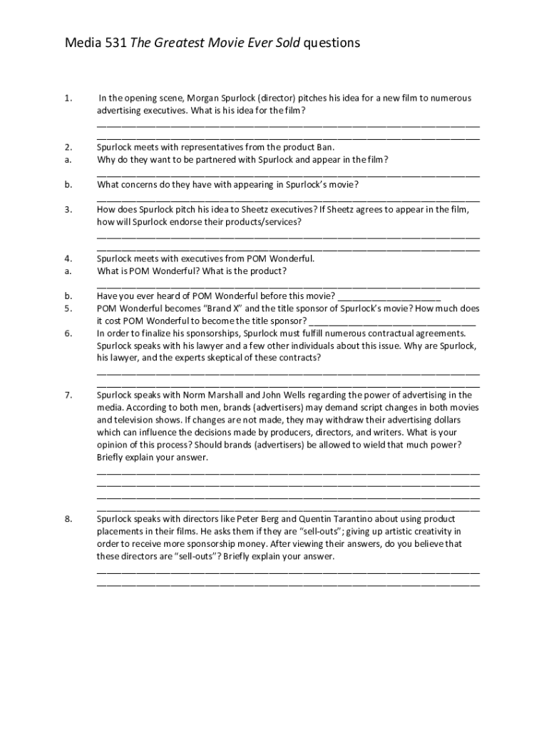 Fillable Online Media 531 The Greatest Movie Ever Sold questions Fax