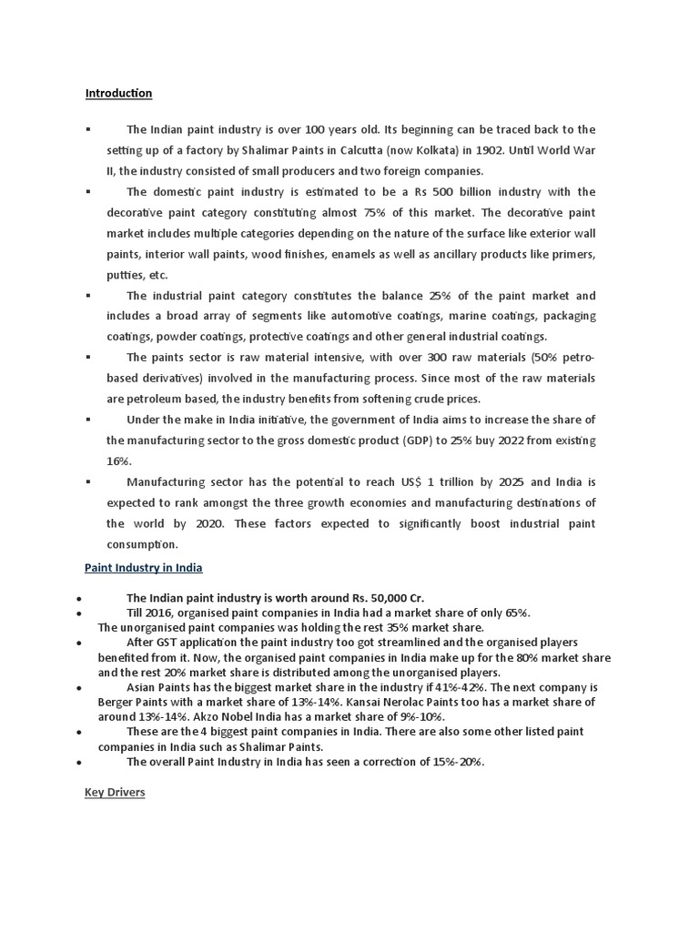 Paint Industry In India Pdf Decorative paint industry in india the decorative paint segment includes multiple categories depending on the. Decorative paint industry in india the decorative paint segment includes multiple categories depending on the. For arriving at the future market estimates factors such as gdp, iip,. the indian paint industry is dominated by organised players, constituting approximately 70% of the total market. this overall presentation consists of study on below topics: indian paint industry analysis. this chart shows how the paints industry has performed relative to the construction industry, automotive industry. the indian paint industry brought revolutionary changes in indian industry in the form of market orientation, customer. After being affected by covid disruption in 2020 and.