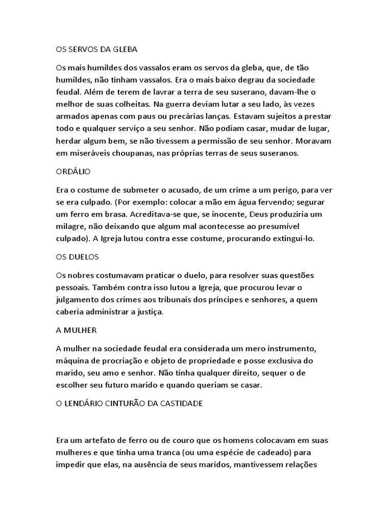 O que é feudalismo? DNE Blog O Que Os Servos Da Gleba Os servos eram trabalhadores das grandes terras comandadas pelos 'senhores' e viviam nas redondezas da propriedade. Era ligado à gleba, não sendo, portanto, um homem livre em toda a força do termo. A jurisdição senhorial significava que o senhor feudal tinha autoridade legal sobre os habitantes de suas terras, incluindo os servos da gleba. Mas então os que se denominavam. O Que Os Servos Da Gleba.