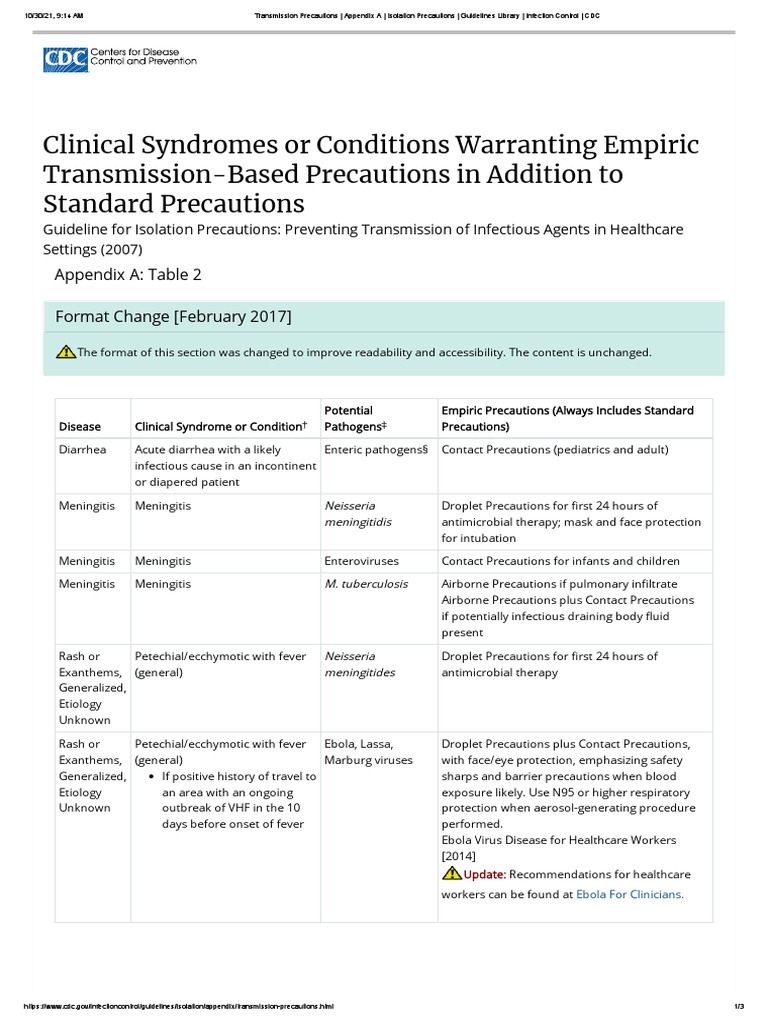 Bioterror Agents Appendix A Isolation Precautions Guidelines Cdc Transmission Based Precautions Appendix droplet precautions plus contact precautions, with face/eye protection, emphasizing safety sharps and barrier. contact precautions recommended in settings with evidence of ongoing transmission, acute care settings with. Type and duration of precautions recommended for selected infections and conditions from the. Cdc Transmission Based Precautions Appendix.