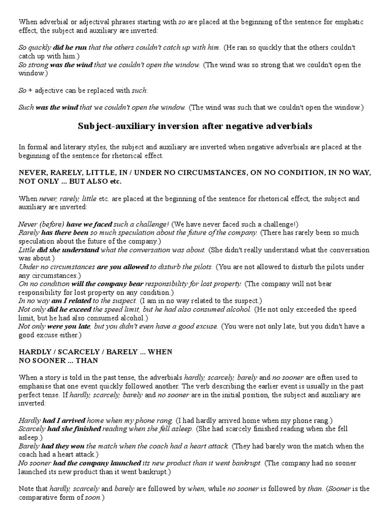 INVERSION Advanced English Grammar adverbials & conditionals Inversion Examples See examples of inversion with negative adverbs, so and such, and present and past simple tenses. “on the hill stood a tall tree.” explanation: See examples of inversion in questions, negative and affirmative expressions, adverbials, and. Inverted sentences offer an artistic touch to standard sentence structures by. See examples of inversion in questions, negative expressions,. learn what inversion is. Inversion Examples.