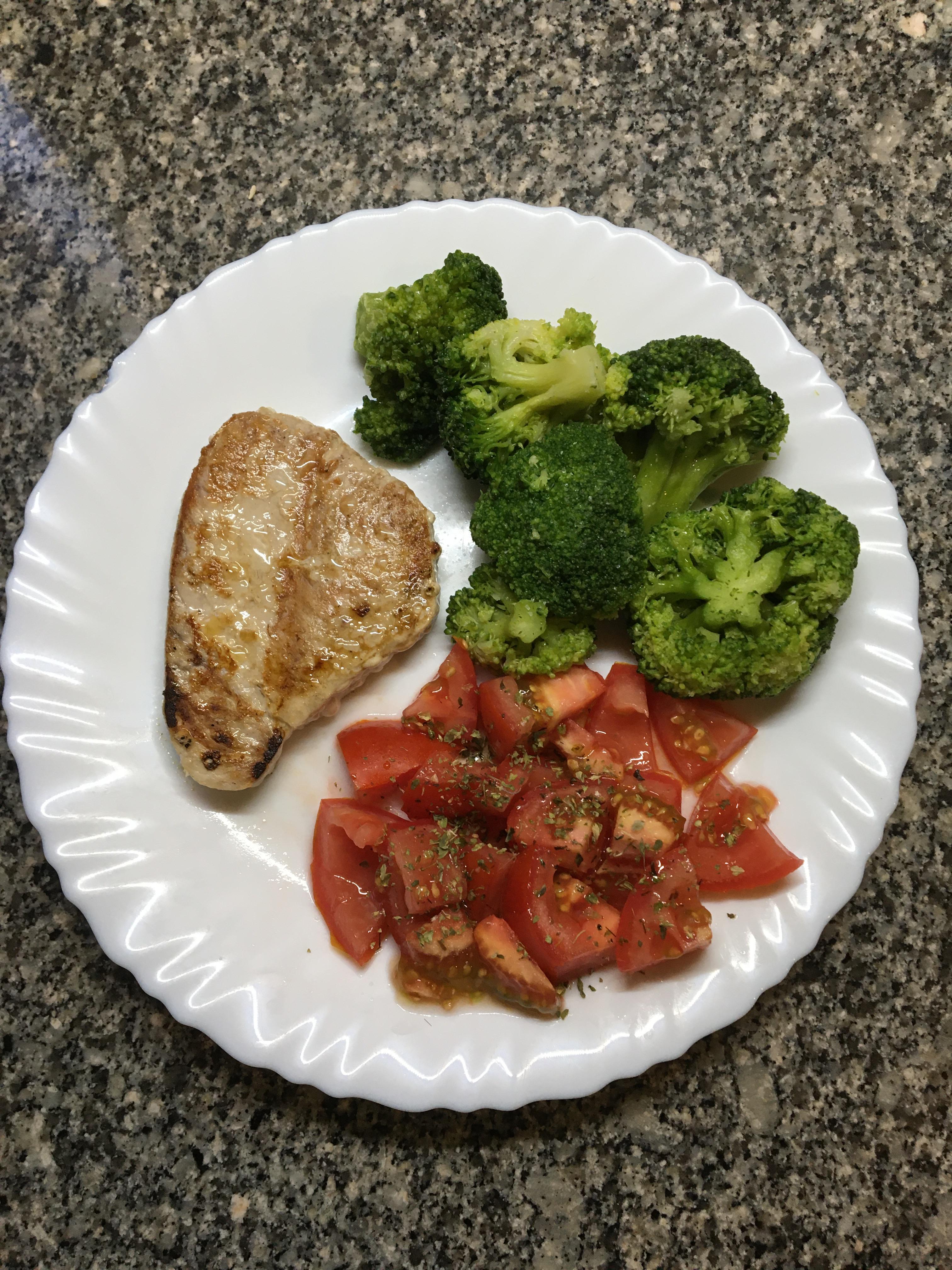 Tasty and healthy lunch tuna (50 kcal) + tomato (12 kcal) + broccoli