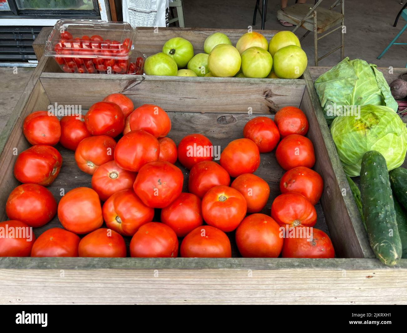 Bright red Florida tomatoes at a fruit and vegetable stand in Orlando