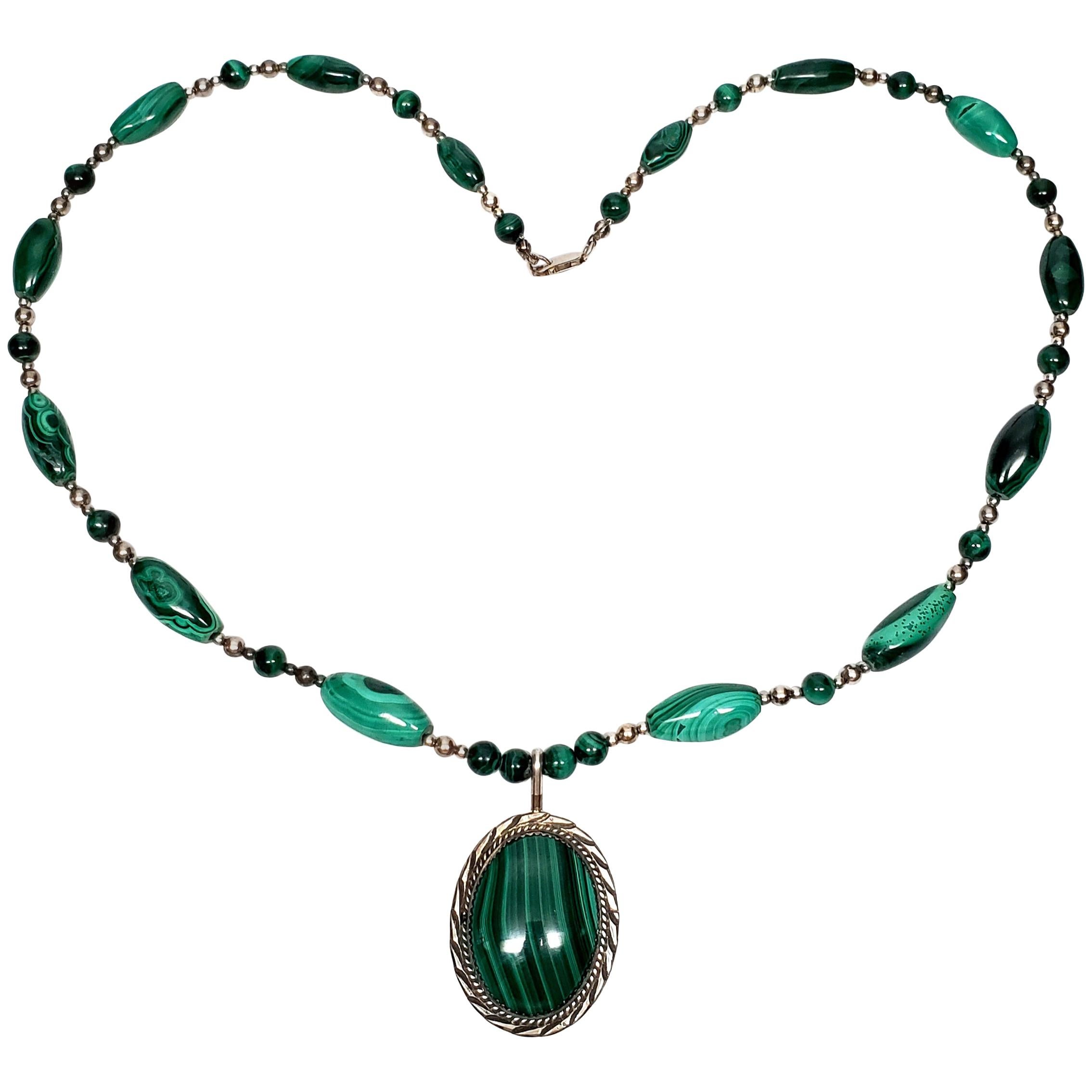 Native American Sterling Silver Malachite Beaded Pendant Necklace at
