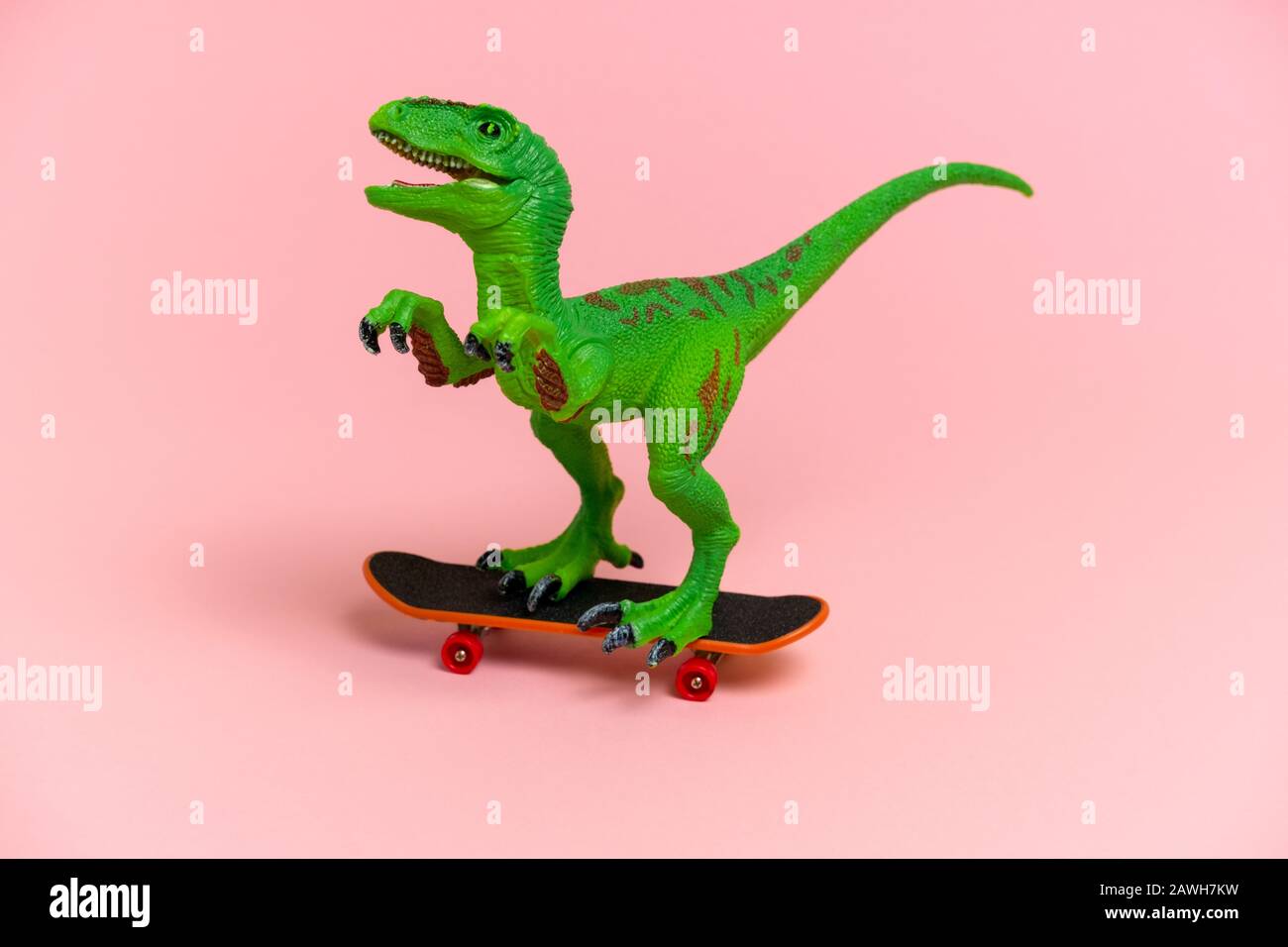 cute green dinosaur toy with skate isolated on a pink background Stock