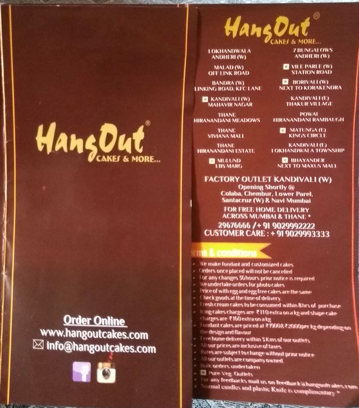 Hangout Cakes & More Menu and Price List for Mulund West, Mumbai