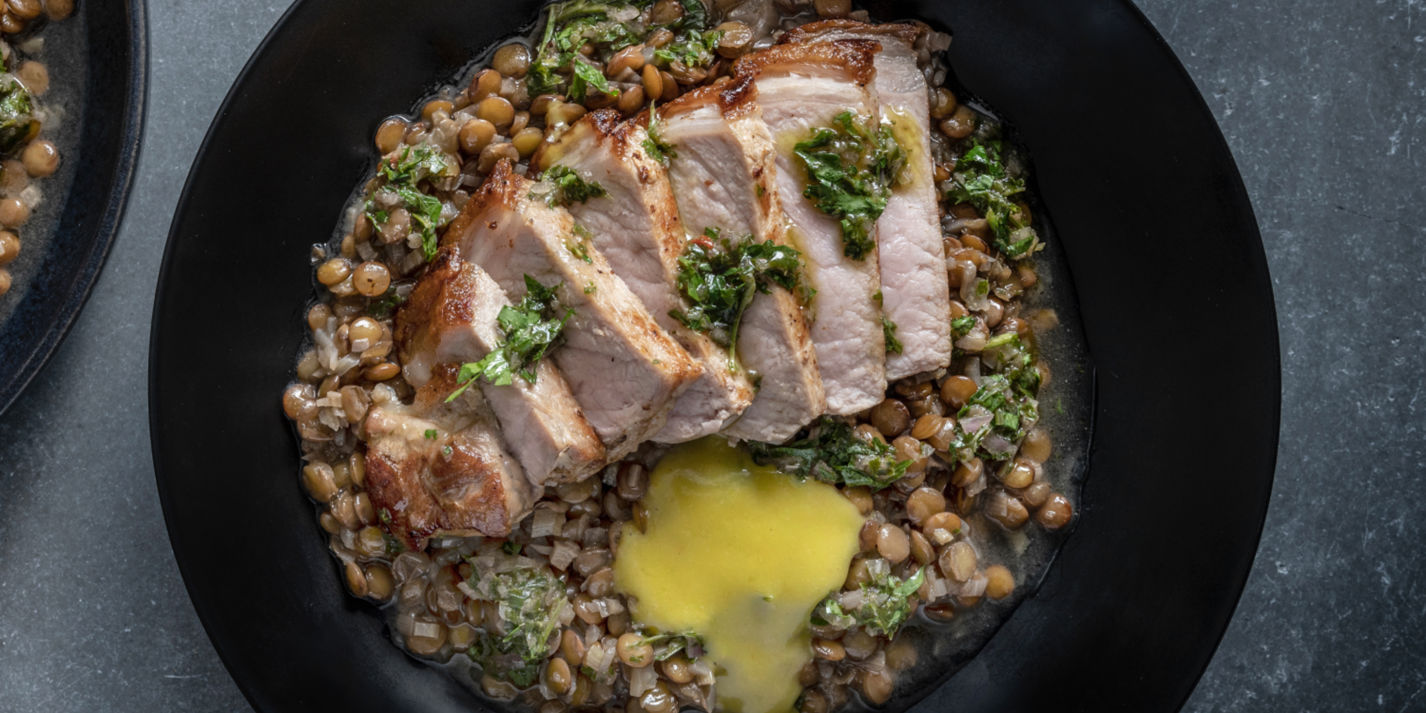 Pork Chop with Braised Lentils and Saffron Aioli Recipe Great British