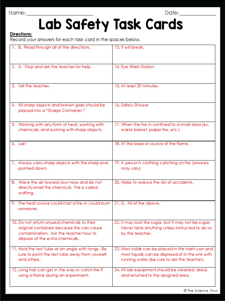 Task Cards Lab Safety ANSWERS PDF