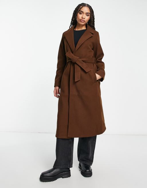 QED London belted longline coat in chocolate brown ASOS