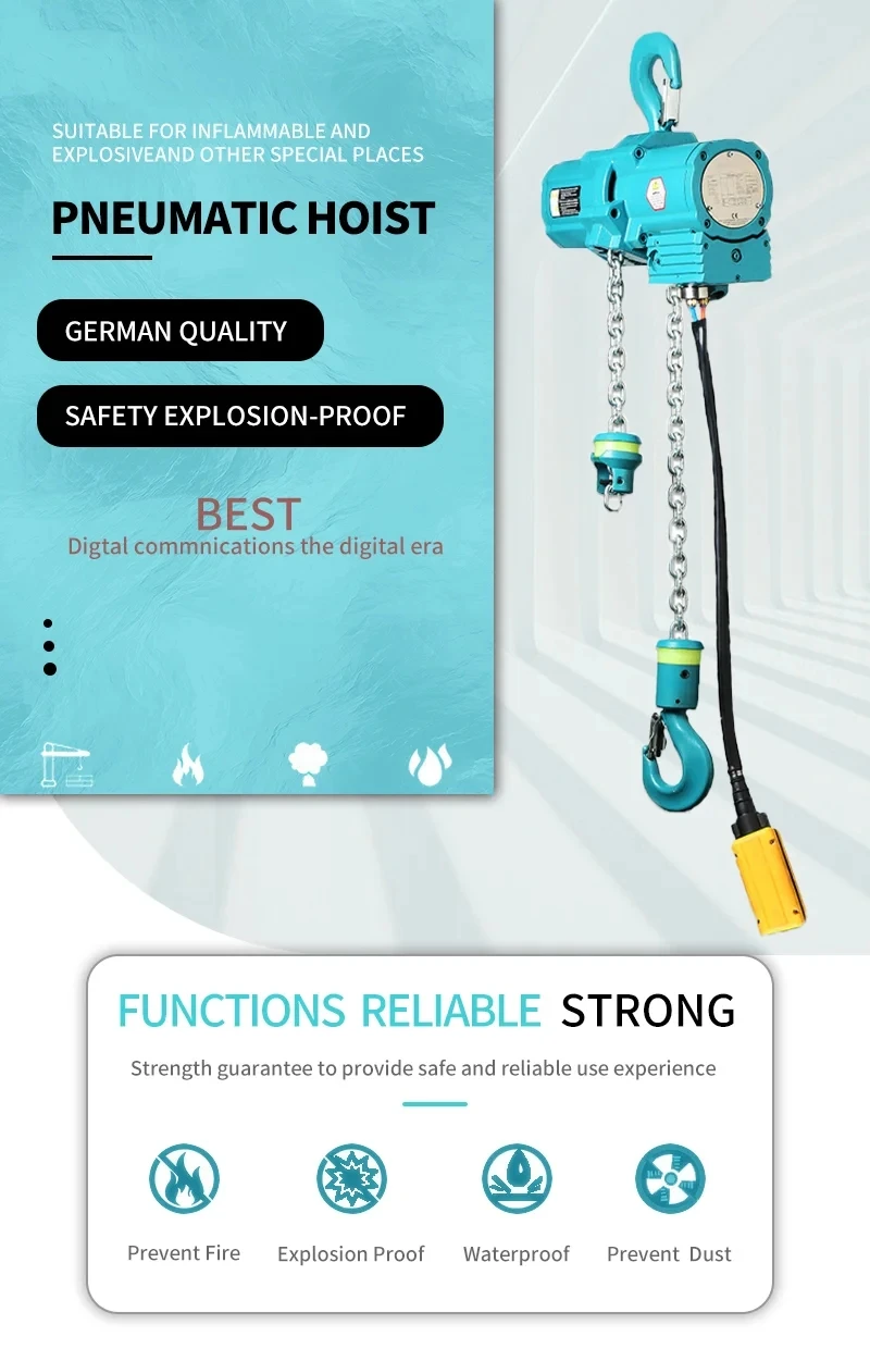 Custom Design Electric Chain Hoist , 2 Ton Pneumatic Air Hoist High Pneumatic Chain Hoists Change or hold the speed at any time during operation so you can start. Air chain hoists move heavy loads, provide fast lifting and lowering speeds, and have unlimited run times for continuous operation. These hoists have an aluminum body, stainless steel chain, and bronze hooks for spark resistance. These hoists have an aluminum body, stainless steel chain, and bronze. Pneumatic Chain Hoists.