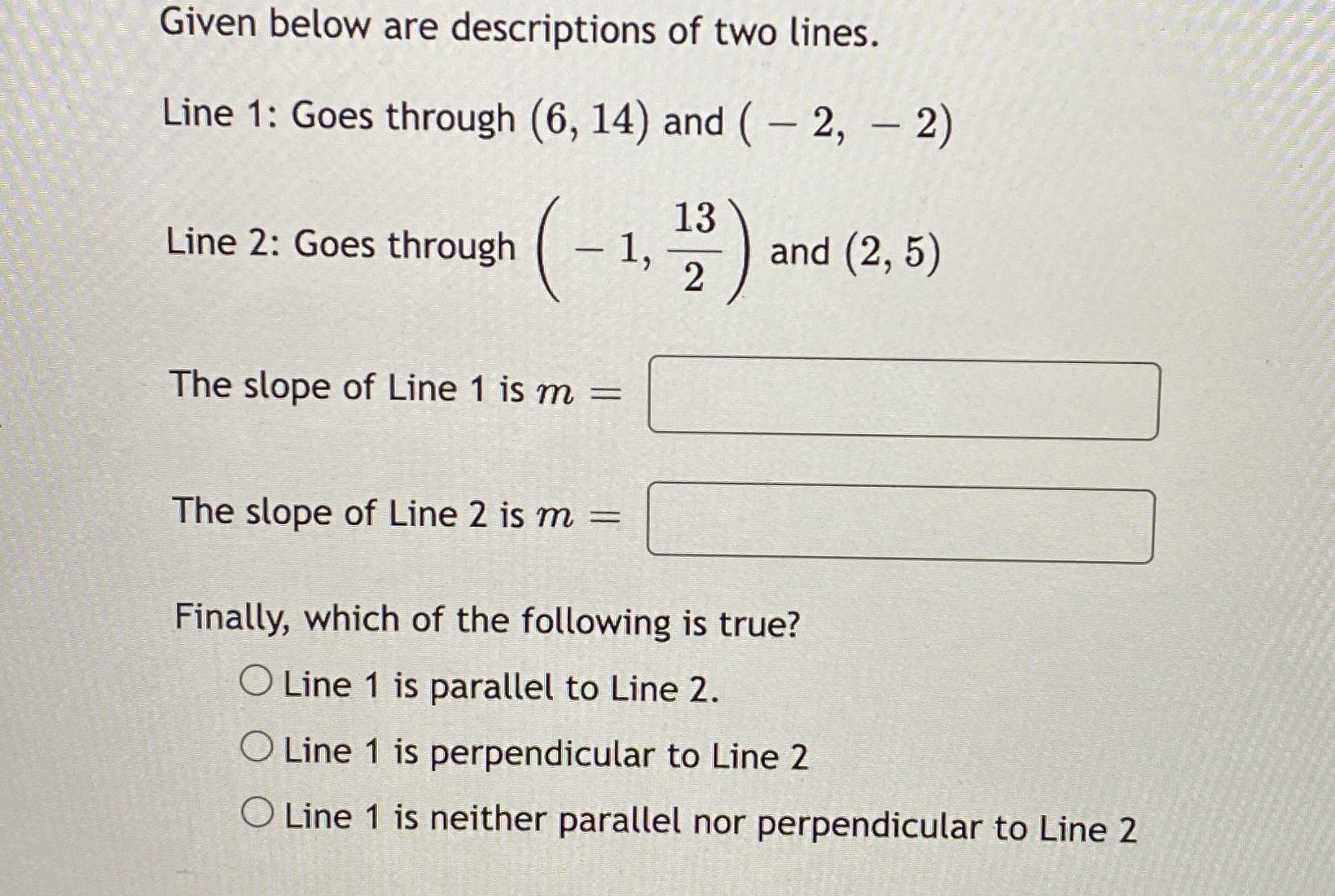 Solved Given below are descriptions of two lines. Line 1 Descriptions Of A Line No height, width, or depth. Definition of a line explained in detail along with the various types of lines. Also learn to differentiate between a line , a line segment and. The lines which are drawn vertically are called vertical lines. When a line moves from left to right in a straight direction, it is a. So those points can. Descriptions Of A Line.