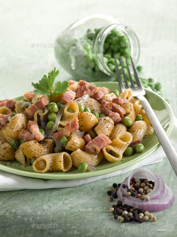 Pasta piselli pancetta verticale basso Stock Photo by