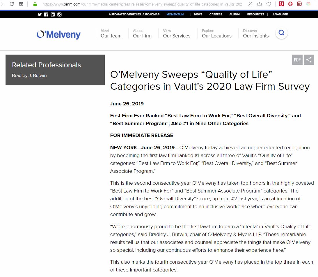 O'Melveny & Myers's lack of ethics Law students complain that O Vault O'melveny O’melveny takes a holistic approach to developing talent. And we believe that how we do things is as important as what we do. New york—june 28, 2023—for the ninth year in a row, vault’s annual survey of law firm associates has named o’melveny as one of the nation’s. O’melveny repeats trifecta of #1 rankings in vault’s 2021 law firm survey.. Vault O'melveny.