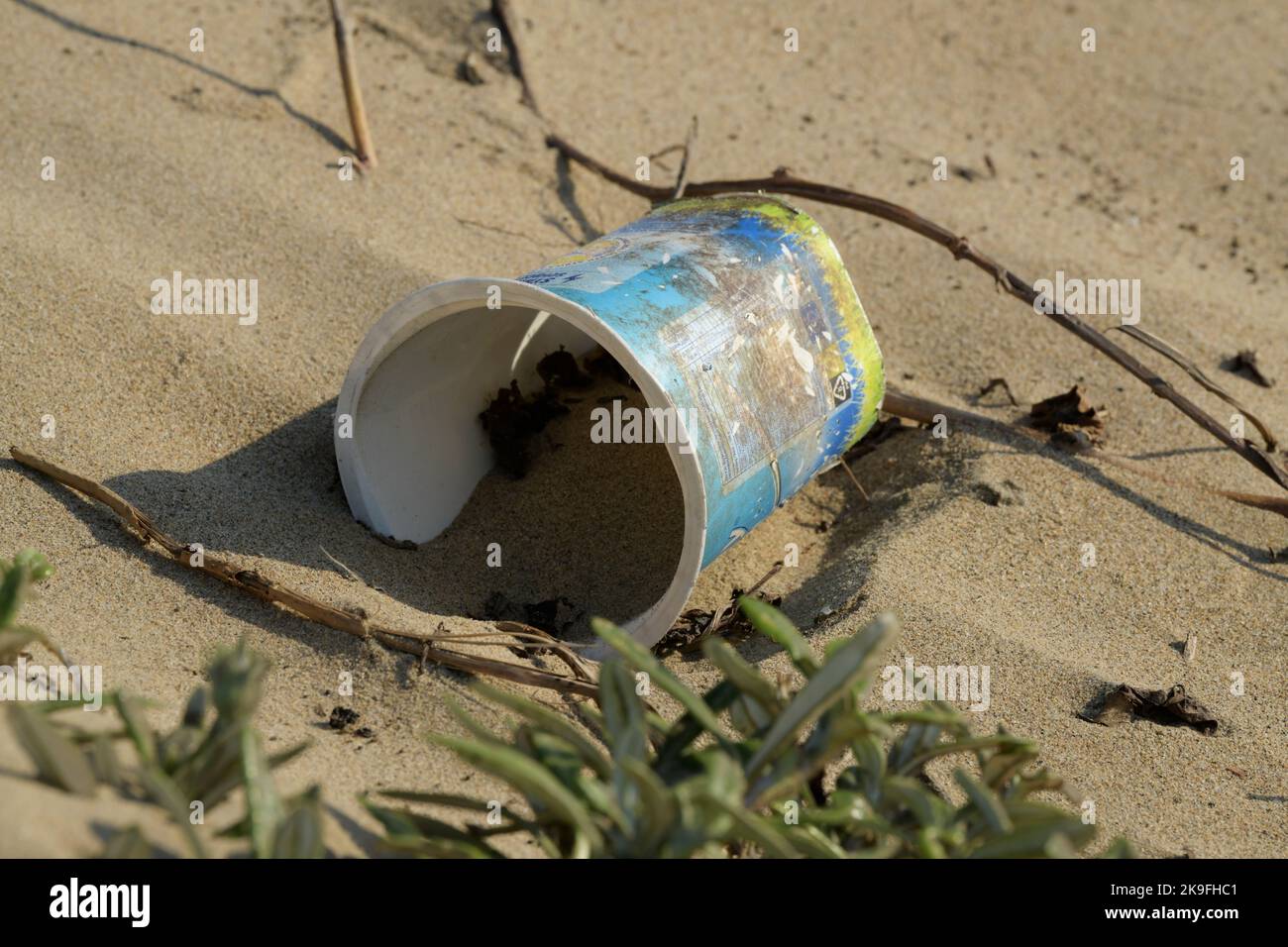 Plastic pollution, single use food packaging in beach sand, dirty