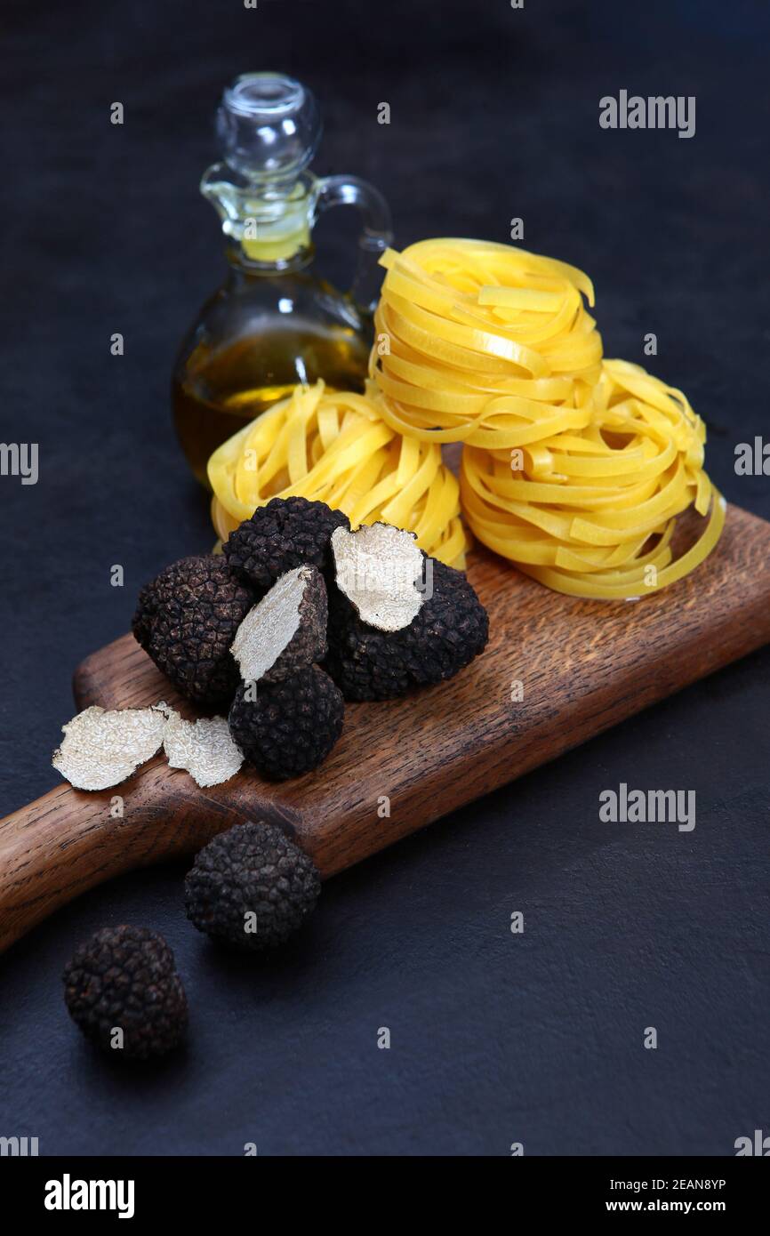 Black truffle on a wooden Board with nest paste and olive oil. The
