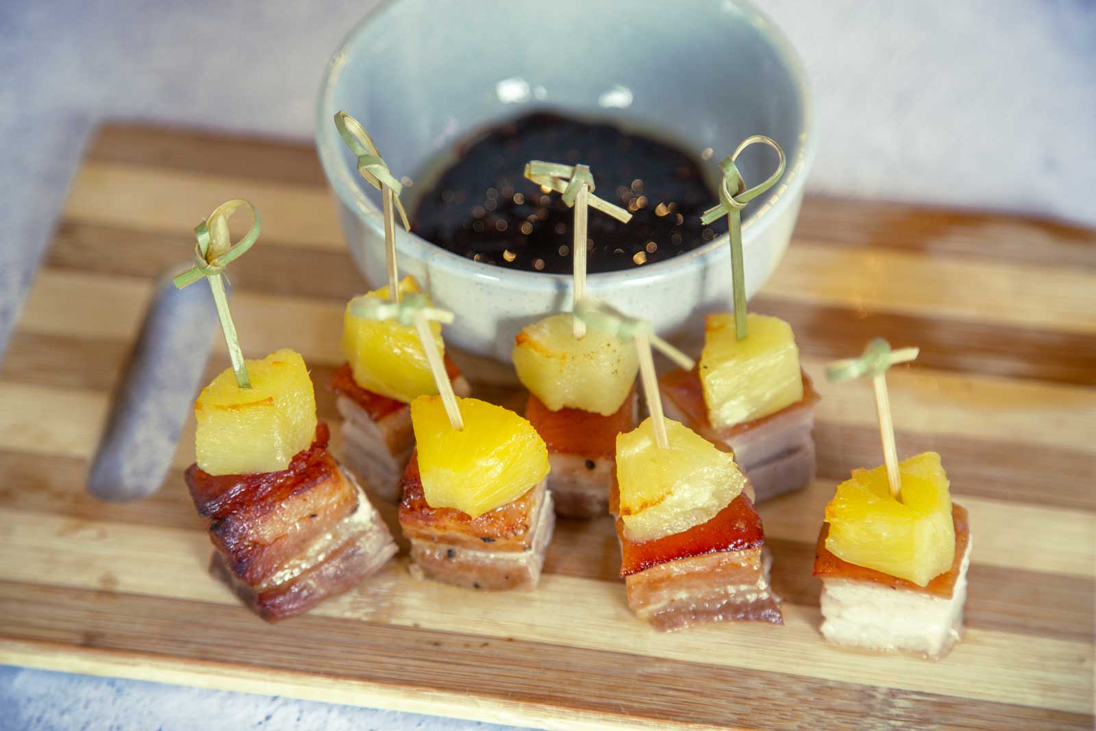 NZ pork belly bites, topped with grilled pineapple NZ Pork