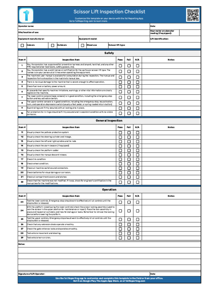 PreUse Scissor Lift Inspection Form Fast Line Safety Training Scissor Lift Inspection Frequency inspection frequency for scissor lift equipment typically falls into two categories: how frequently does lifting equipment need to be inspected? frequency of inspections may have to be increased when operating in harsh conditions, for example corrosive, dusty,. Depending on the type of gear and. unless there is an 'examination scheme' specifying other intervals, thorough examinations should. Scissor Lift Inspection Frequency.