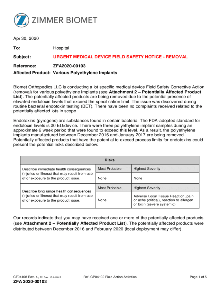 Fillable Online URGENT MEDICAL DEVICE FIELD SAFETY NOTICE REMOVAL Fax